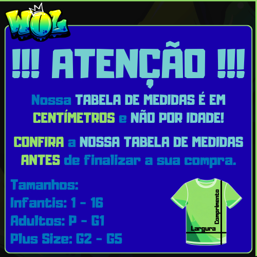 👋 Bem-vindo à Way Of Life! ⚠️ ATENÇÃO ⚠️ ❗ Antes de finalizar sua compra, confira nossa tabela de medidas! As medidas estão em centímetros (cm), e não por idade. Assim, fica mais fácil escolher o tamanho ideal e evitar trocas. 📏 TABELA DE MEDIDAS INFANTIL -------------------------------------------- Tamanho - Altura - Largura -------------------------------------------- 1 35 30 2 40 32 4 43 34 6 46 37 8 49 49 10 53 40 12 55 42 14 59 44 16 63 47 -------------------------------------------- ADULTO -------------------------------------------- Tamanho - Altura - Largura -------------------------------------------- P 67 51 M 70 54 G 72 59 GG 73 60 G1 74 61 -------------------------------------------- PLUS SIZE -------------------------------------------- Tamanho - Altura - Largura -------------------------------------------- G2 76 63 G3 80 66 G4 84 68 G5 92 77 -------------------------------------------- 💡 Dicas para escolher o tamanho certo: Compare as medidas com uma roupa que você já tenha e que sirva bem. Se estiver entre dois tamanhos, escolha o maior para mais conforto. Evite medir o corpo diretamente — roupas podem variar conforme o tecido. 🧺 Cuidados com a sua camiseta Passe sempre pelo avesso. Não passe o ferro sobre a estampa. Prefira lavar à mão. Use água fria e sabão neutro. Não torça e não deixe de molho. Seque à sombra, em local arejado. Evite pendurar pelas pontas, para não deformar a peça. 🧵 Sobre o Produto Material confortável e de ótima qualidade. Costura reforçada e acabamento impecável. Cores vivas e estampas detalhadas. Ideal para o dia a dia, passeios e lazer. 🚚 Envio Rápido e Seguro Todos os pedidos são preparados com cuidado e enviados rapidamente. Acompanhe seu pedido pelo aplicativo Shopee com total segurança. ❓ Perguntas Frequentes As medidas são por idade? Não, são em centímetros para garantir mais precisão. As roupas encolhem? Não, nossos produtos mantêm o tamanho após a lavagem. Tem troca ou devolução? Sim! Solicite pelo chat da Shopee dentro do prazo. O tecido é confortável? Sim, tecidos macios para o dia todo. Posso alterar meu pedido? Se ainda não foi despachado, entre em contato pelo chat da da loja, dentro da plataforma Shopee. Posso personalizar? Sim! Converse conosco antes da compra. Se for possível, cuidaremos de cada detalhe. Problema com o produto? Entre em contato antes de avaliar. Resolveremos defeitos ou erros. Problema com a entrega? Entre em contato pelo chat da Shopee. Acompanharemos seu pedido e resolveremos rapidamente. ✨ Obrigado por acreditar no nosso trabalho! Com carinho, Way Of Life 💛💚💙