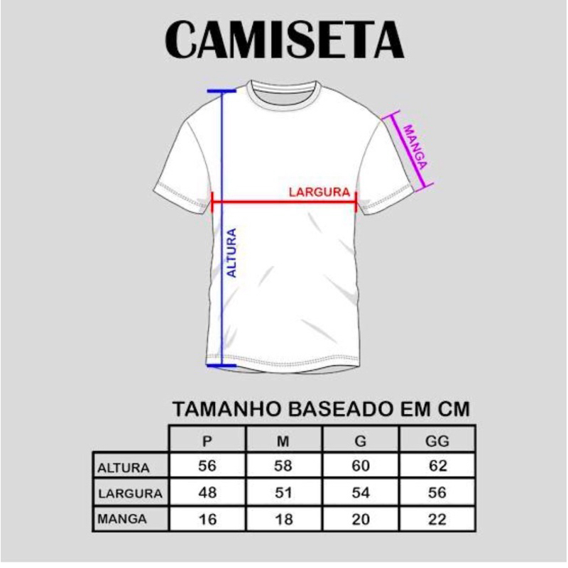 Nossas camisas são confeccionadas com material de qualidade e impressão em DTF com tecnologia avançada que garante alta durabilidade e não estraga a cada lavagem. Fazemos envios no mesmo dia se o pedido for feito até às 12:00 hrs após esse horário o envio e feito no dia posterior. Qualquer dúvida esclarecemos via chat. Aguardamos seu pedido. FICHA TÉCNICA: Modelo: Camiseta Material: 100% de algodão com Fio 30.1 penteado Estampa Cores disponíveis nos tamanhos P, M, G e GG: Preta e Branca DETALHES: Tamanhos quando comparados com o que você usa de calça jeans: P: Veste 38 M: Veste 40 G: Veste 42 GG: Veste 44 (As dimensões podem variar de até 2(dois) cm - para mais ou para menos)