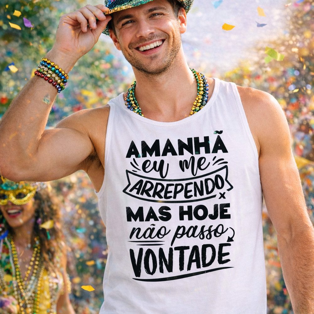 Vista a alegria do Carnaval com nossas camisetas regata cheias de humor e estilo! Perfeitas para bloquinhos, festas e muita folia, são leves, confortáveis e com estampas exclusivas para você se destacar. Escolha seu modelo favorito e aproveite o Carnaval com muito conforto e diversão! MEDIDAS: (ALTURA X LARGURA) P - 68cm x 52cm M - 70cm x 55cm G - 72cm x 57cm GG - 76cm x 59cm XG - 79cm x 62cm