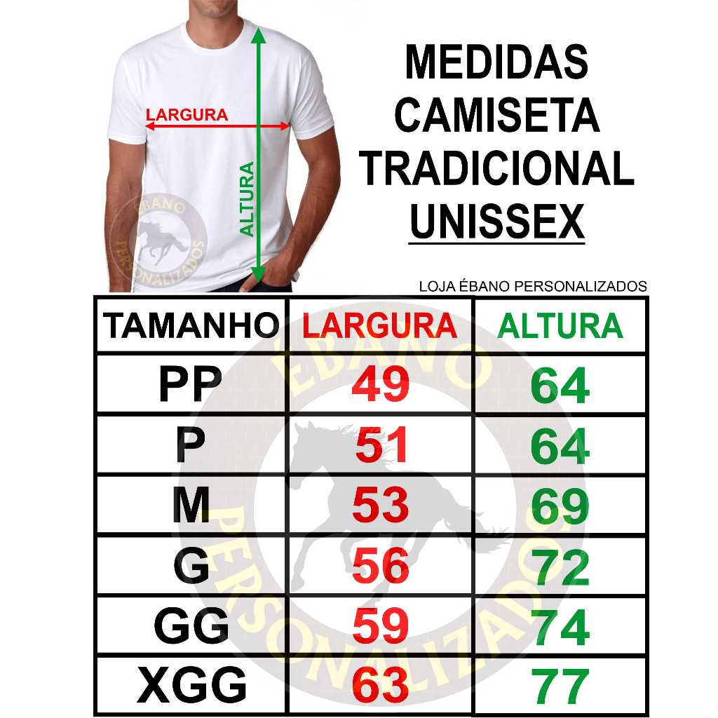 MODELO UNISSEX (destinado tanto para o gênero masculino quanto feminino). Modelagem tradicional de corte reto. Malha estampada na parte frontal. Tecido 100% Poliéster Tecido com Toque Macio. Excelente qualidade e durabilidade, a estampa não deixa relevo, pois penetra diretamente nas fibras do tecido, além de não rachar e não desbotar. Pedimos que observe as medidas antes da compra para evitar devoluções devido ao tamanho errado, pois são produtos personalizados e as devoluções geram prejuízos para nós. Medidas: MODELO TRADICIONAL UNISSEX PP - 49cm largura x 64cm altura P - 51cm largura x 64cm altura M - 53cm largura x 69cm altura G - 56cm largura x 72cm altura GG - 59cm largura x 74cm altura XGG - 63cm largura x 77cm altura TAMANHO INFANTIL 01 ano - 31 cm largura x 36 cm altura 02 anos - 32 cm largura x 39 cm altura 04 anos - 35 cm largura x 43 cm altura 06 anos - 38 cm largura x 47 cm altura 08 anos - 39 cm largura x 50 cm altura 10 anos - 43 cm largura x 56 cm altura 12 anos - 45 cm largura x 59 cm altura 14 anos - 48 cm largura x 63 cm altura