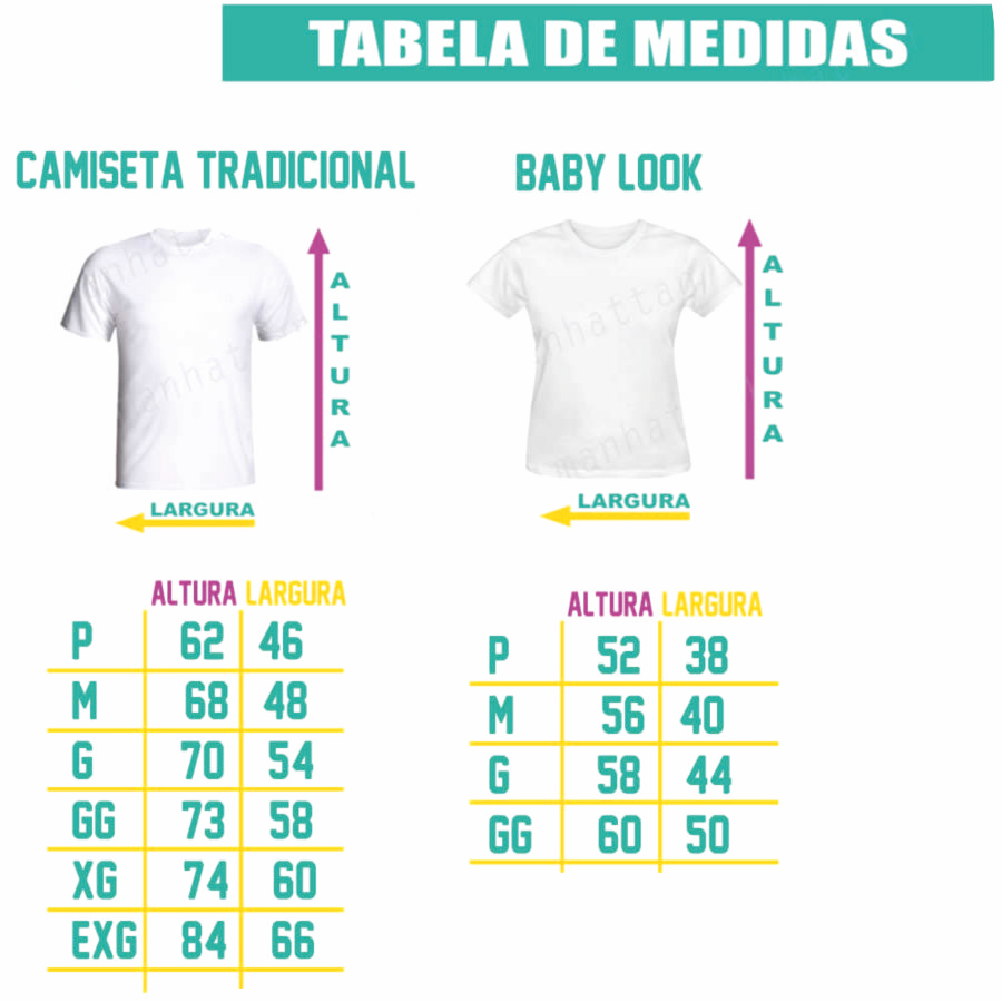 DESCRIÇÃO DO PRODUTO: ⭐ Camisa tradicional (unissex) ⭐ Blusa feminina ( babylook) ⭐ Tecido 100% Poliéster (Secagem Rápida, Não Desbota, Não Encolhe, Não Amassa) ⭐ Leve, confortável ( Excelente Custo Benefício) ⭐ Estampa em Serigrafia ( Silk) *** Confira a tabela de medidas antes de finalizar a compra, lembrando que as mesmas podem variar em até 2 cm para mais ou para menos. ***** TABELA DE MEDIDAS ***** (NÃO EFETUAMOS TROCAS POR TAMANHOS DEVIDO A CUSTO DE FRETE. FAVOR CONFERIR COM ATENÇÃO) UNISSEX P - Largura 46 cm x Comprimento 62 cm UNISSEX M - Largura 48 cm x Comprimento 68 cm UNISSEX G - Largura 54 cm x Comprimento 70 cm UNISSEX GG - Largura 58 cm x Comprimento 73 cm BABYLOOK P - Largura 38 cm x Comprimento 52 cm BABYLOOK M - Largura 40 cm x Comprimento 56 cm BABYLOOK G - Largura 44 cm x Comprimento 58 cm BABYLOOK GG - Largura 50 cm x Comprimento 60 cm Siga nossa loja para acompanhar as novidades e não perder as promoções!