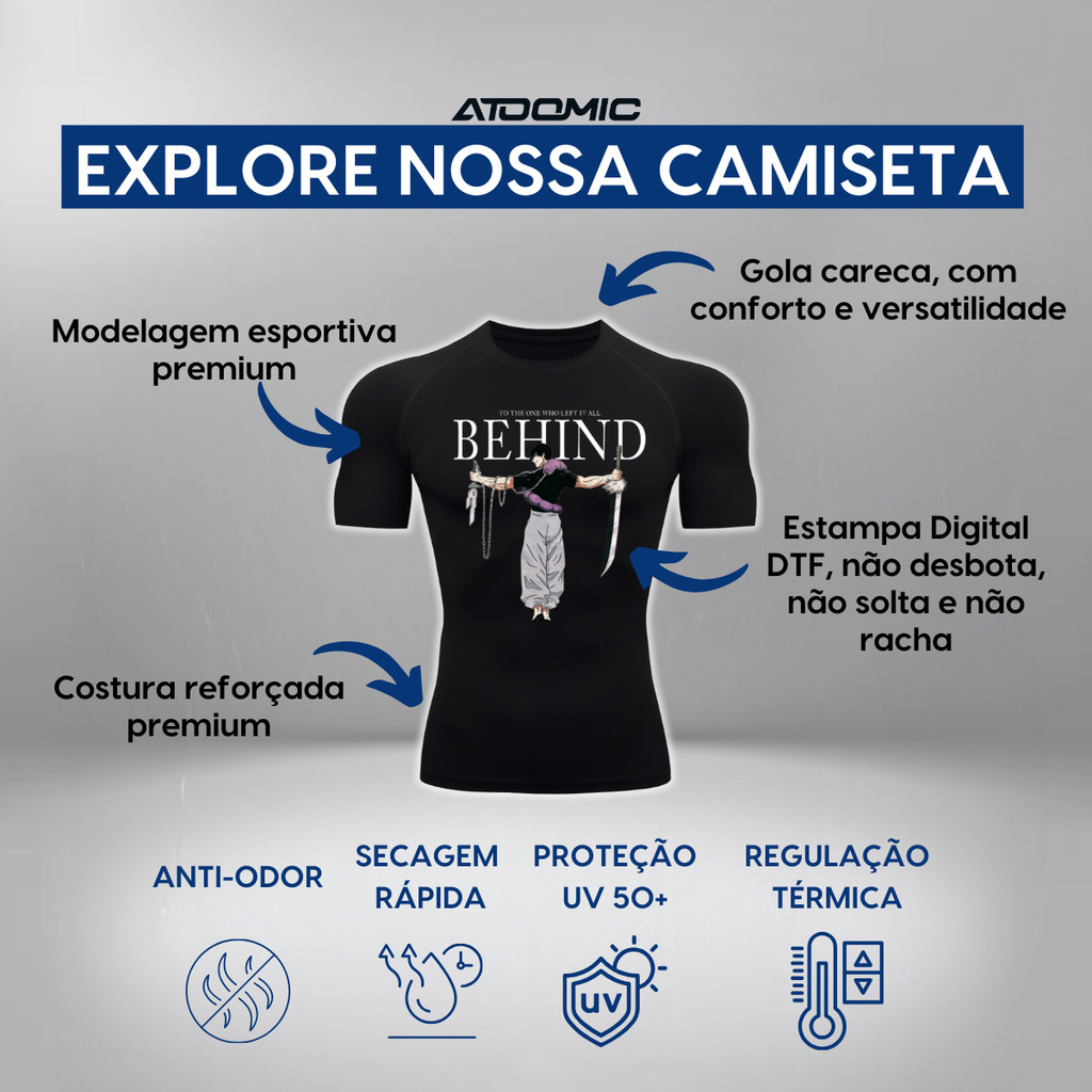 *ESTAMPA NA FRENTE* Camisa Térmica Segunda Pele UV 50+ PROTECTION, criada para proteger a pele da ação nociva dos raios UV-A e UV-B, com o fator de proteção solar FPU 50+ presente em seu DNA. Bloqueia de 99% dos raios UV-A e UV-B, além de um fator de proteção 50 (FPU 50+) que não sai após as lavagens. Composição: 90% Poliéster 10% Elastano Proteção UV: Adequado para exposição ao Sol, o efeito de proteção UV é permanente. Uso: Piscina; Praia; Trilha; Pescaria; Caminhada; Corrida; Atividades ao Ar Livre; Voo a Vela; Veleiro; Ciclismo; Corrida etc... Tipo: Manga Curta Gola: Redonda Origem: Nacional - Fabricação Própria Garantia: Defeito de fabricação. Cuidados: Dispensa o uso de amaciante, Dispensa o uso de ferro de passar