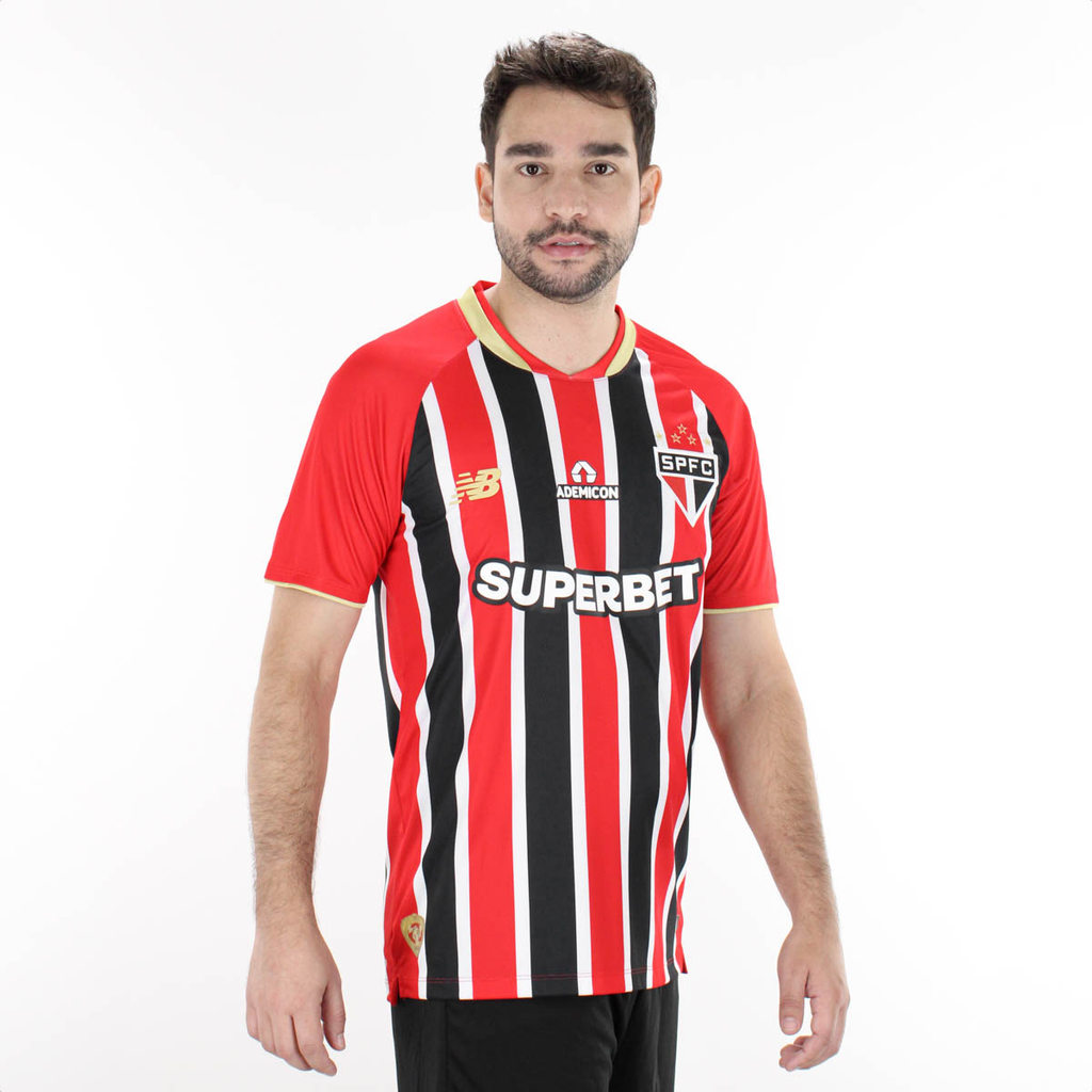 Vista a história do Tricolor em grande estilo! Camiseta de Time New Balance São Paulo Torcedor Away 2025 Vermelho - Masculino Ficha Técnica: Marca: New Balance Clube: São Paulo FC Cor: Vermelho, branco e preto Gênero: Masculino Indicação: Torcida, uso diário e colecionadores Material: 97 Poliéster e 3% Elastano / Costas: 96,5% Poliéster e 3,5% Elastano Gola: Redonda com recorte em V Mangas: Curtas Design: Inspirado no uniforme de 2005, com listras verticais clássicas em vermelho, preto e branco Diferenciais: Homenagem aos 20 anos do tricampeonato mundial, com design moderno e tecido leve Detalhes: Em dourado na gola e nos punhos das mangas, escudo do time bordado, selo na barra lateral em transfer e inscrição em japonês na parte interna do escudo, com a frase “São Paulo FC, forte e corajoso” Este é mais do que um uniforme - é um tributo à glória. Porque investir: Com design icônico, tecido confortável e um corte moderno, essa peça une paixão e estilo para os verdadeiros torcedores. Perfeita para relembrar o tricampeonato mundial de 2005 com orgulho em cada detalhe. Conteúdo da embalagem: 1 Camiseta de Time New Balance São Paulo Torcedor Away 2025 Vermelho – MasculinoParte superior do formulário