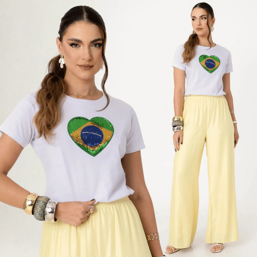 | Camiseta Do Brasil Feminina Bordada Lantejoulas 100% Algodão Blusa ... este produto | R$ 29,99 | 50% | 4.9/5 | 103 |