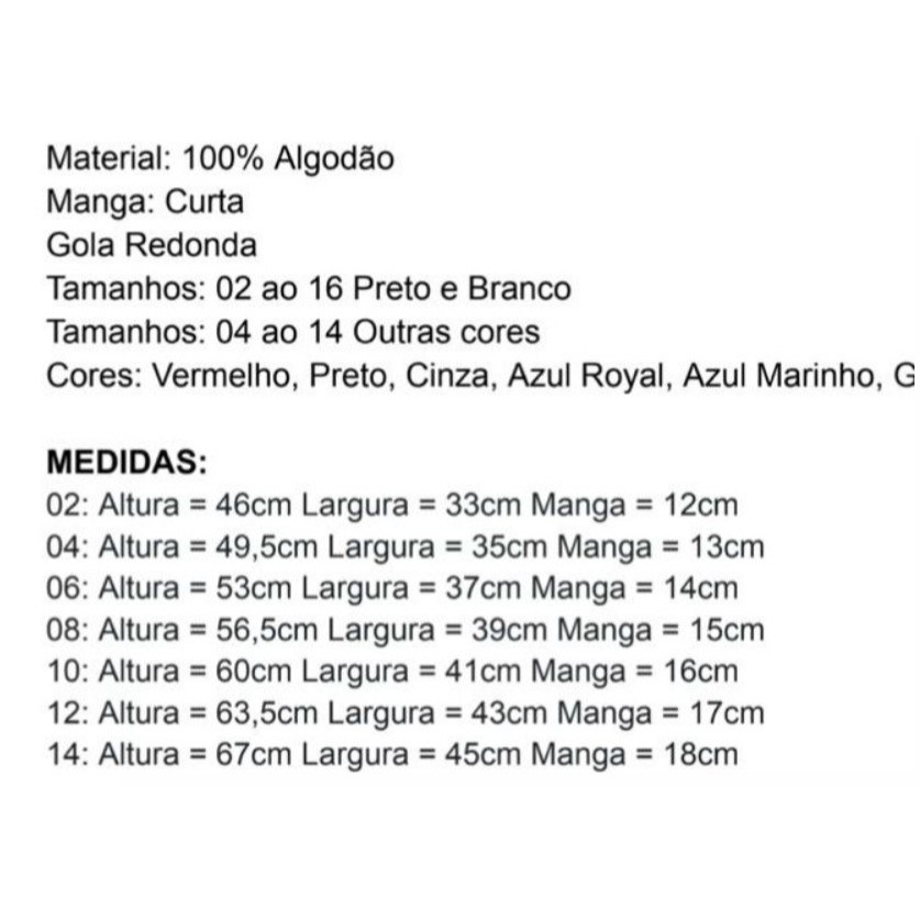 CAMISETAS LINDAS UNISSEX ----------------------------------------------------------------- • MELHOR PREÇO E QUALIDADE PREMIUM • TODOS TAMANHOS ----------------------------------------------------------------- **********CARACTERSTICAS TÉCNICAS******* MATERIAL: Material fio 30.1 MODELO: Manga curta e Gola Redonda GÊNERO: Unissex ESTAMPA: Film de Recorte Importado TAMANHO DA ESTAMPA: PEITO LATERAL 10 CM PEITO CENTRAL 28 CM ESTAMPA GRANDE FRENTE/COSTAS 37 CM A 40 CM OBS. Não desbota, estampa não sai, não desbota, gola com acabamento reforçado. -------------------------------------------------------------- **********************MEDIDAS********************* Tamanho P – LARGURA 50cm – COMPRIMENTO 65cm – MANGA 22cm Tamanho M – LARGURA 52cm – COMPRIMENTO 68cm – MANGA 22cm Tamanho G – LARGURA 54cm – COMPRIMENTO 71cm – MANGA 23cm Tamanho GG – LARGURA 56cm – COMPRIMENTO 73cm – MANGA 23cm Tamanho 2 – LARGURA 34cm – COMPRIMENTO 39cm – MANGA 14cm Tamanho 4 – LARGURA 37cm – COMPRIMENTO 41cm – MANGA 15cm Tamanho 6 – LARGURA 38cm – COMPRIMENTO 45cm – MANGA 17cm Tamanho 8 - LARGURA 42cm – COMPRIMENTO 48cm – MANGA 18cm Tamanho 10 –LARGURA 43cm – COMPRIMENTO 49cm – MANGA 18cm Tamanho 12 –LARGURA 46cm – COMPRIMENTO 56cm – MANGA 19cm Tamanho 14 –LARGURA 49cm – COMPRIMENTO 58m – MANGA 20cm