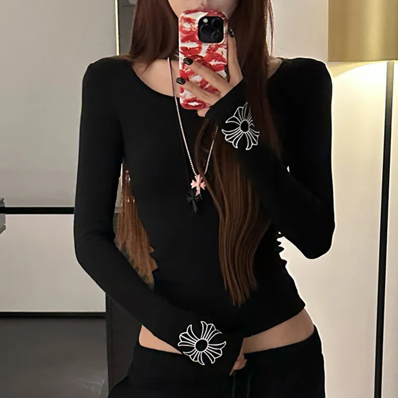 Camiseta Estampada De Manga Comprida Justa Para Meninas Picantes Y2K Mulheres , Gola Redonda , Cintura Apertada , top In