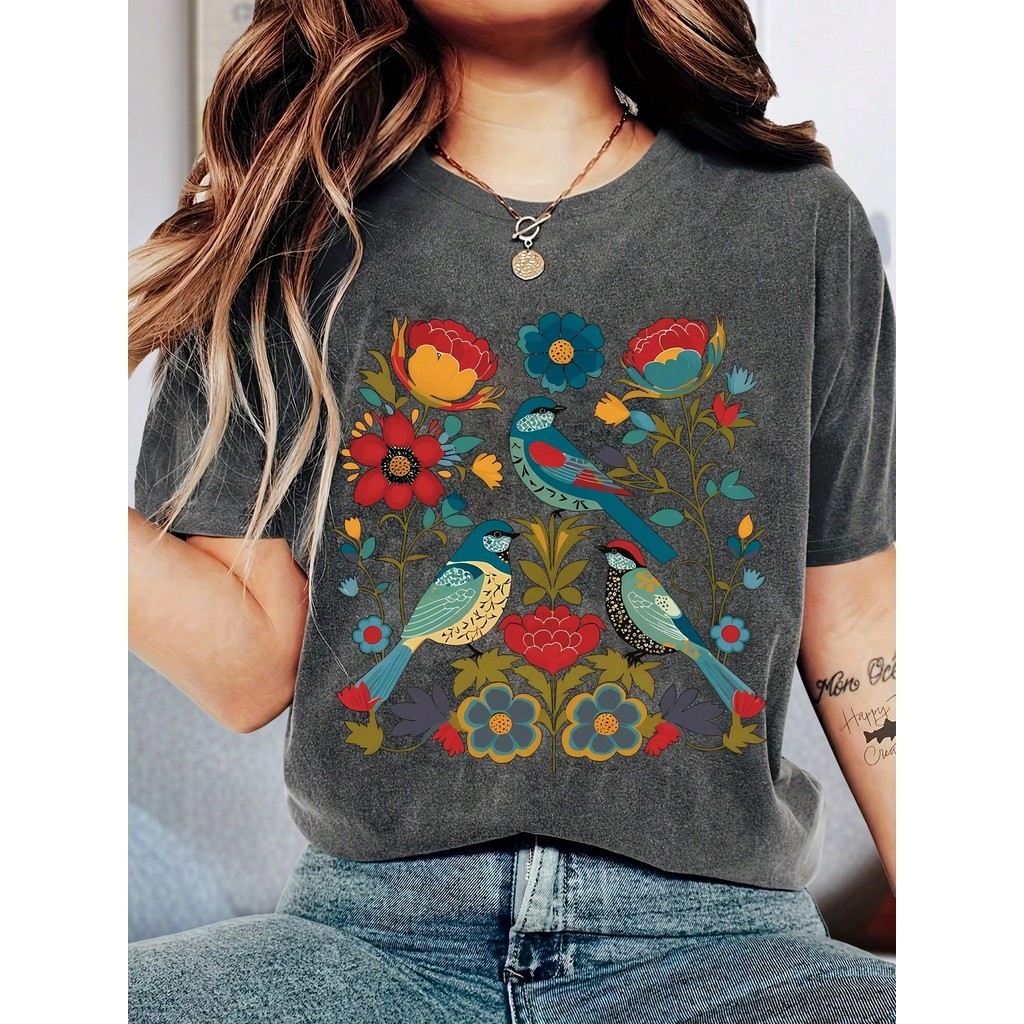 Camiseta Feminina Com Estampa Vintage de Flores e Pássaros Verão CMS imediato