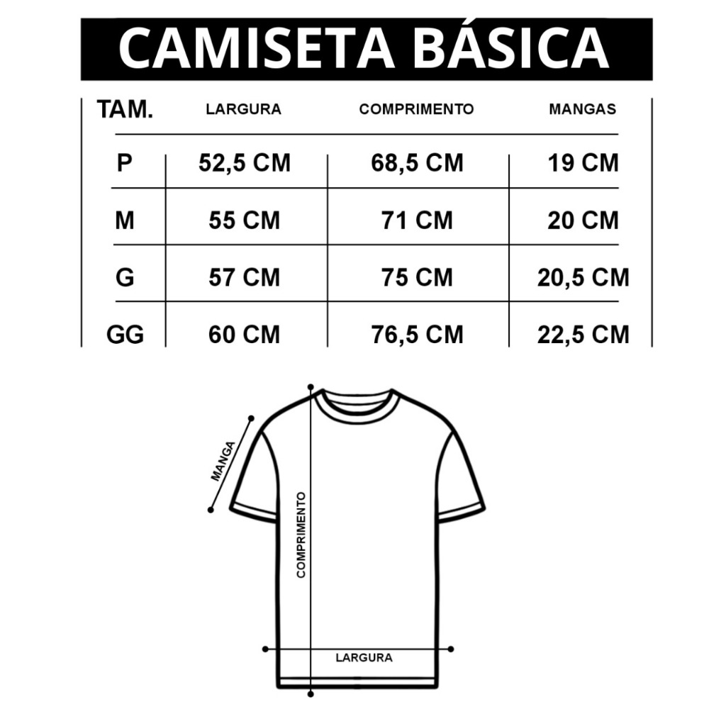 MC Style está desde 2015 no mercado da moda católica, unindo fé, estilo e qualidade em cada peça. Somos uma confecção própria especializada em criar modelos e estampas exclusivas, inspiradas na devoção e no bom gosto do nosso público. Atuamos no atacado e varejo, levando nossas criações para todo o Brasil com foco em beleza, conforto e propósito. Aqui, cada camiseta é feita com carinho, fé e autenticidade, para quem gosta de vestir sua crença com estilo. Camiseta Básica 100% Algodão Premium – Conforto e Estilo em Qualquer Ocasião Essencial no guarda-roupa, nossa camiseta básica é confeccionada em malha 100% algodão 30.1, proporcionando toque macio, caimento perfeito e excelente respirabilidade para o dia a dia. Com costura reforçada ombro a ombro e acabamento de qualidade, é ideal para quem busca durabilidade, conforto e estilo. Detalhes do produto: Tecido: Algodão 30.1 (não encolhe facilmente) Modelagem: Tradicional unissex Gola: Reforçada com ribana canelada Costuras firmes e resistentes Ideal para personalização, estamparia e uso diário Indicado para: Academia, passeio, trabalho, uniformes, eventos e revenda. Disponível em diversas cores e tamanhos: P, M, G, GG. Guia de Tamanhos TAM - LARGURA COMPRIMENTO MANGAS P 52 68 19 M 55 71 20 G 57 75 20 GG 60 76 22