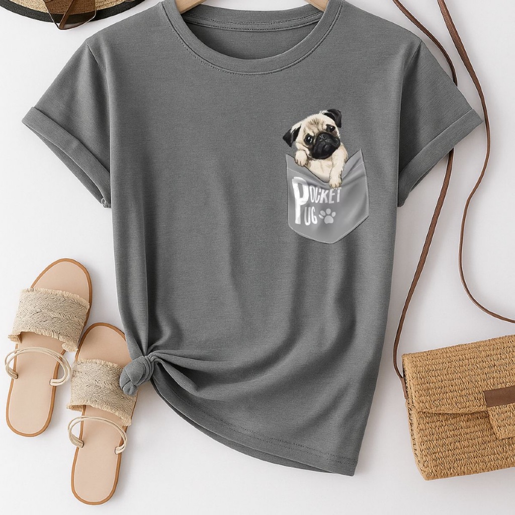 Camiseta Feminina estampa Pug No Bolso Oversize 100% algodão.