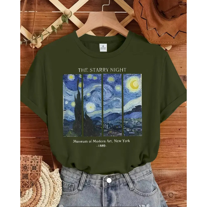 Camiseta Feminina Estampada Obra de Van Gogh Noite Estrelada Camisa Manga Curta Casual Básica SPD PREMIUM