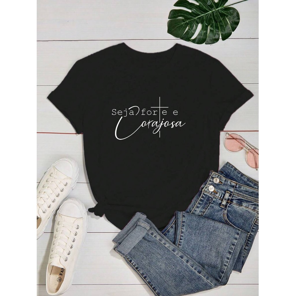 Camiseta Feminina Frases Motivacionais Seja Forte E Corajosa Cruz 100% Algodão Várias Cores SPD IMEDIATO