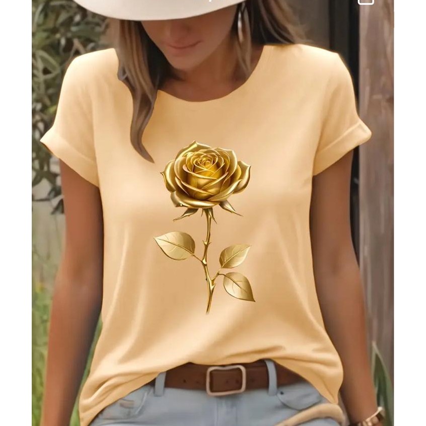 Camiseta Feminina Linda e Estilosa Estampa ROSA DOURADA Blusa 100% Algodão