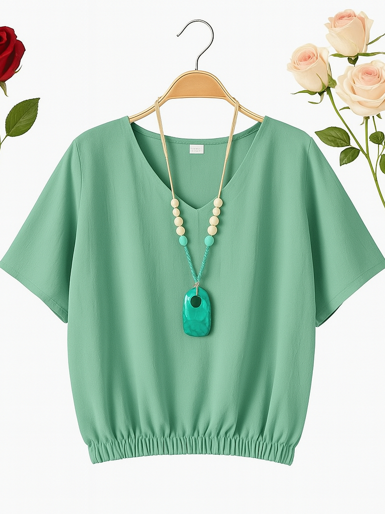 ✨ Blusa feminina com elástico na cintura cola V tecido crepe dunas com toque suave, caimento impecável e estilo que valoriza o corpo com conforto. Perfeito para usar no dia a dia ou arrasar em ocasiões especiais! 💃 🌿 Tecido leve e confortável 📏 Tamanhos disponíveis: M, G e GG M comprimento 54 Busto 106 Cintura 106 G Comprimento 56 Busto 112 Cintura 112 GG Comprimento 58 Busto 116 Cintura 116 🎯 Ideal para quem busca praticidade sem abrir mão da elegância Uma blusa versátil, charmoso e pronto para te acompanhar em todos os momentos! 💖 Blusa Feminina Gola V Manga Curta Soltinha - Moda Casual 🧡Blusa feminina em tecido leve, confortável e fresquinho. Modelo com decote em V, mangas curtas e barra com elástico, que garante um caimento perfeito e moderno. Ideal para usar no dia a dia, no trabalho, em passeios ou até eventos mais casuais.