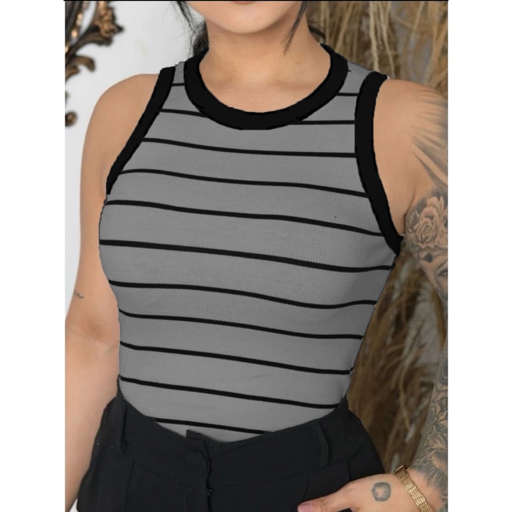 Camiseta Feminina Regata Canelada Listrada e Lisa Ribana Camiseta Básica Blusa Regata Casual