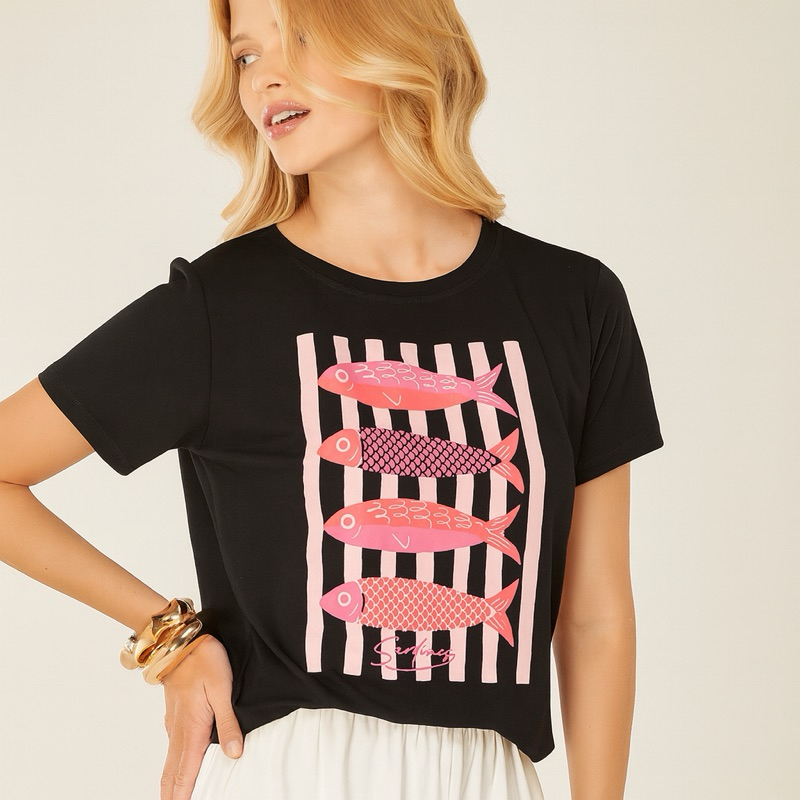 Camiseta Feminina Sardines Estampa Peixes Verão Confortável