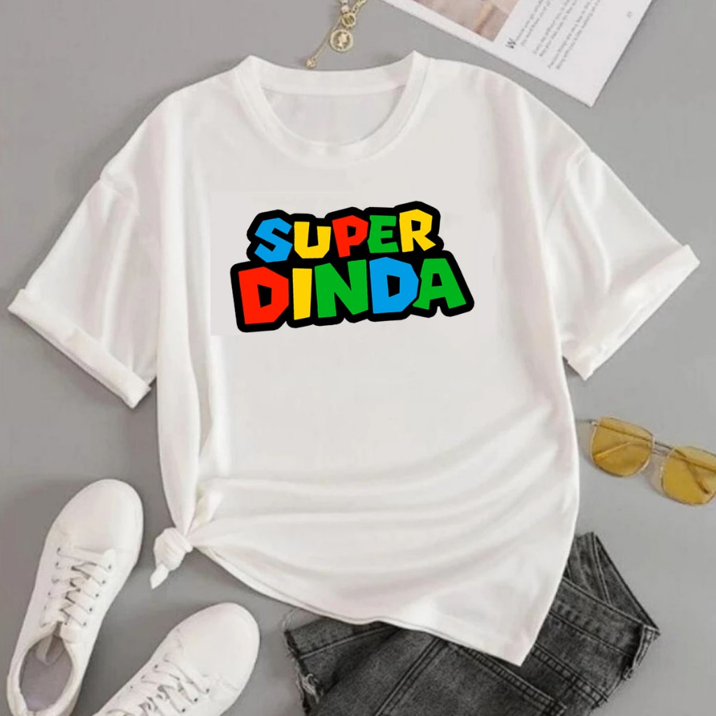 Camiseta Feminina T Shirt Algodão Casual Super Dinda Madrinha Tia Familia Frase Super Mario Bross Game Jogo Old