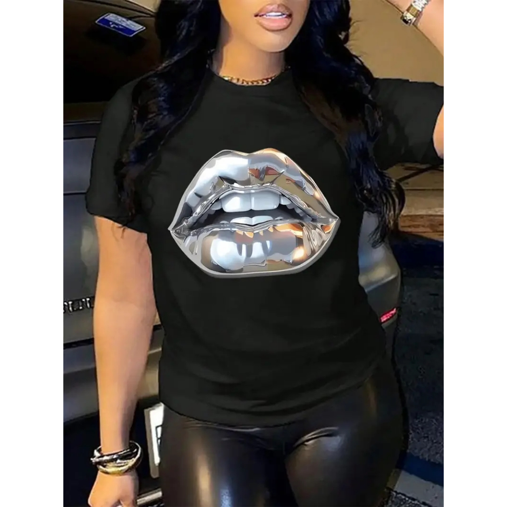 Camiseta Feminina T-Shirt Algodão Premium Estilosa Estampa Lábios Prateado