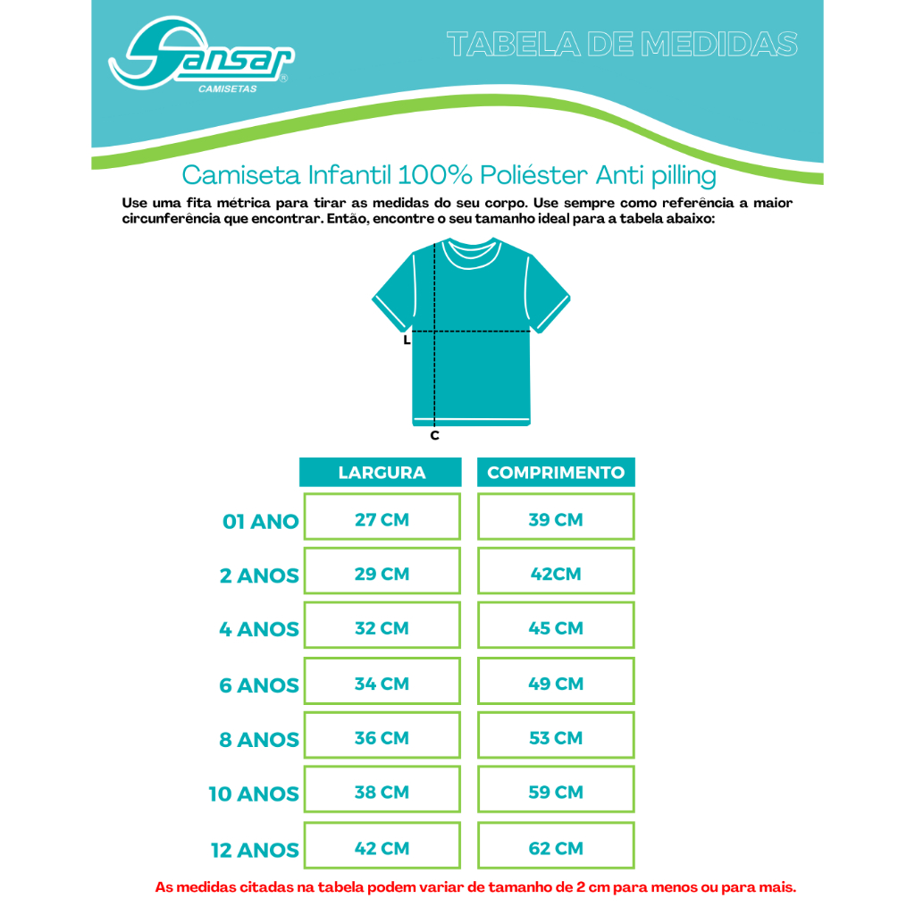 ATENÇÃO: ANTES DE CONCLUIR A COMPRA CONFIRA A TABELA DE MEDIDAS PARA UMA ESCOLHA DE TAMANHO MAIS ASSERTIVA A camiseta de poliéster da Sansar é desenvolvida com malha 100% poliéster Anti Pilling (reduz o aparecimento de bolinhas) com fio 28/1 Vortex, com gramatura de malha de 165g/m² ± 5% e uma costura reforçada com pesponto na gola, o que proporciona qualidade e durabilidade ao produto. Por ser lisa, a peça abre possibilidades de personalização em estamparia ou bordados para empresas, escolas, eventos etc. Você sabia que as camisetas de poliéster da Sansar têm muitas vantagens?! Elas são: Confortáveis; Não encolhem; Não desbotam; São de fácil lavagem e não necessitam passar. As camisetas Sansar são reconhecidas pela qualidade do material e acabamento, que conferem maciez e versatilidade.