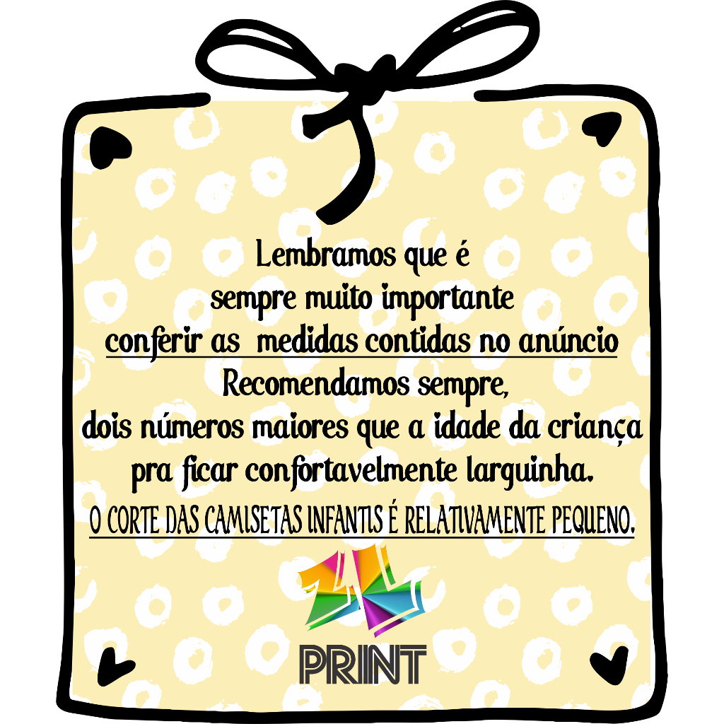 ⚠️ Após efetuar sua compra, 🏃 ENVIE via chat O NOME A SER PERSONALIZADO em seu pedido. Caso não haja informação seu produto será enviado apenas com a estampa do anúncio (sem personalização) ✅ Seguimos criteriosamente o prazo de postagem, para não ocorrer atraso na entrega. Nossas camisetas são unissex, super confortáveis, serve para meninos e meninas tranquilamente. Estampa com cores de alta qualidade imperceptível ao toque da pele! (sem relevo) Para que dê tudo certo 🎯, lembramos que é sempre muito importante conferir as 📏 medidas contidas no anúncio😉 (verifique fotos por favor) 🥰 Recomendamos sempre, dois números maiores que a idade da criança pra ficar confortavelmente larguinha😉 O CORTE DAS CAMISETAS INFANTIS É RELATIVAMENTE PEQUENO. Tamanhos: 2, 4,6,8,10,12,14,16 > Segundo avaliações, NOSSA NUMERAÇÃO COSTUMA SER PEQUENA - PEÇA SEMPRE NUMERAÇÃO MAIOR < - Composição: Malha 100% Poliéster Muito confortável. Cor: Branca * Estampa: Sublimação (tingimento da estampa direto no tecido, sem relevo). - Tamanho de uma sulfite (A4) , e pode ser horizontal ou vertical de acordo com a arte. - Composição: Malha 100% Poliéster Muito confortável. Cor: Branco - Manga Curta * Estampa: Sublimação (tingimento da estampa direto no tecido, sem relevo). Tamanho de uma sulfite (A4) , e pode ser horizontal ou vertical de acordo com a arte. Toda a logística de transporte (🚚COLETA-TRANSPORTE-ENTREGA🚚) é feita pela Shopee. 🥰 Abaixo do produto, tem uma aba de ''Frete gratis com cupom'' com uma setinha > Ali vc consegue ter previsão do prazo de entrega, informado pela plataforma, de acordo com o seu CEP cadastrado😉 INSTRUÇÕES DE LAVAGEM: - Pode ir na máquina de lavar - Passar do avesso Obs. As cores apresentadas na imagem podem sofrer variações de acordo com o dispositivo que esteja sendo utilizado para visualização do produto. Imagem ilustrativa. As medidas podem variar 1 cm para mais ou para menos. 🎈 Obrigada por apoiar um pequeno negócio de uma grande sonhadora🌻