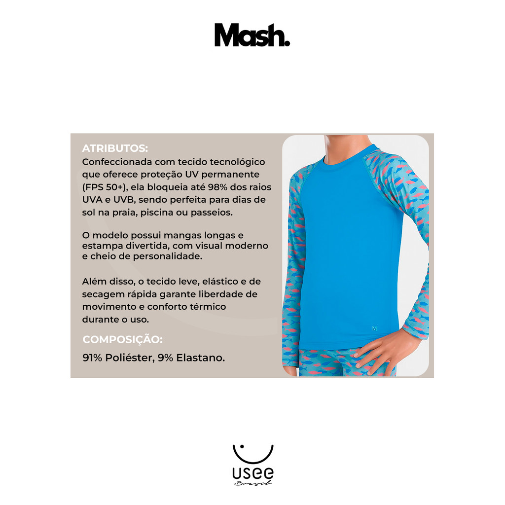 Camiseta Infantil Juvenil UV Manga Longa Estampada Mash