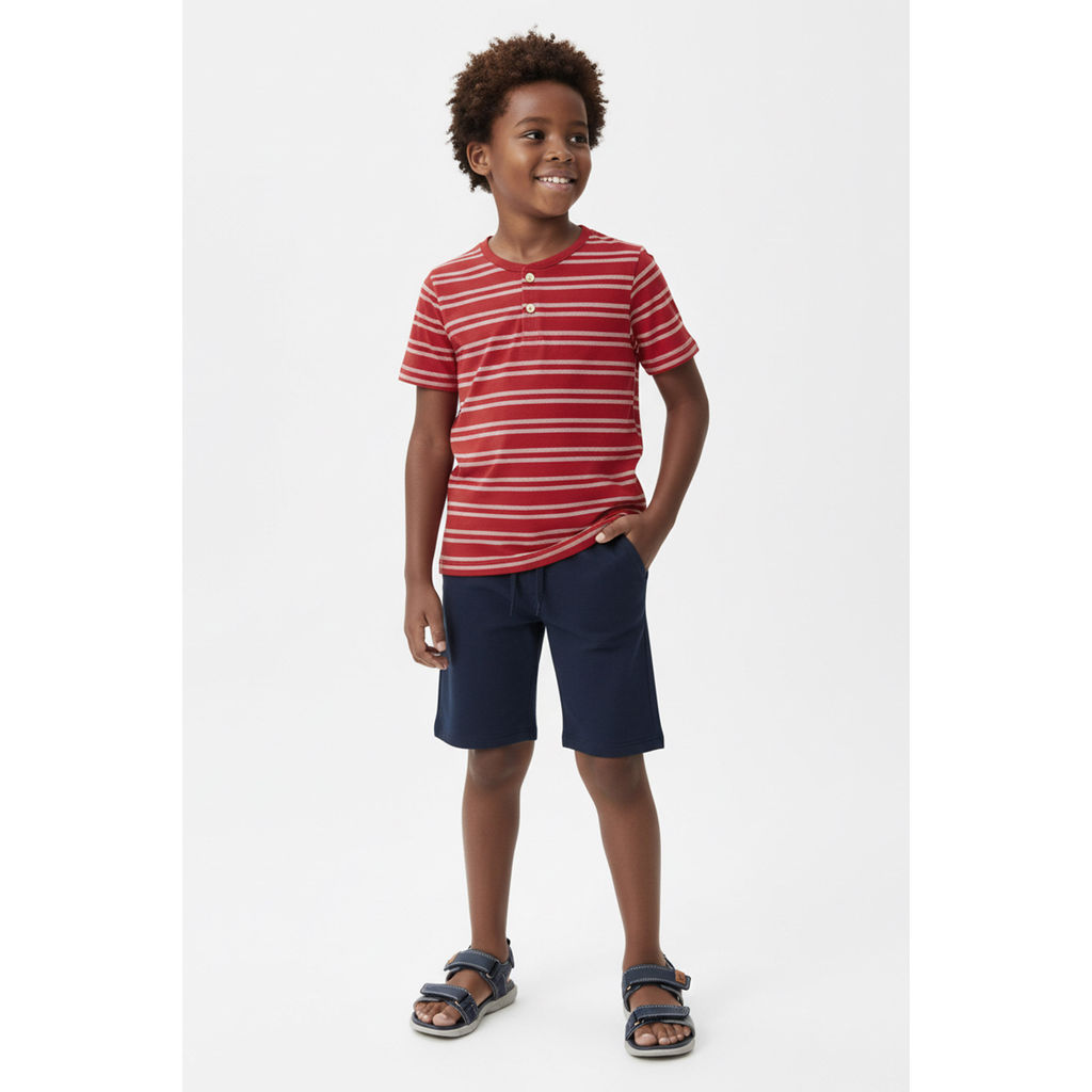 Perfeita para um visual charmoso e confortável, a Camiseta Elian promete ser a preferida dos meninos nessa estação. Feita em malha listrada, ela possui mangas curtas e peitilho com botões decorativos, trazendo um destaque especial para o look. Além disso, sua estampa listrada traz um toque de modernidade para esse clássico que não sai de moda. Ideal para passeios e momentos em família, combine com bermudas, calças ou jeans e garanta uma composição cheia de estilo!Modelo gerado por IA para fins ilustrativos.Detalhes da peça: • Feito em malha listrada • Possui mangas curtas • Possui estampa listrada • Possui peitilho com botões decorativos • Ideal para passeios e momentos em família