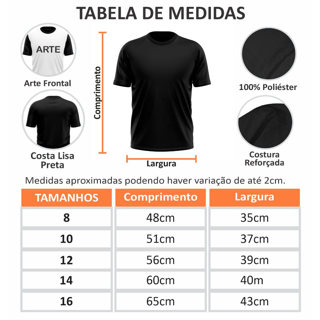 Dê um toque de estilo ao guarda-roupa dos pequenos com esta camiseta infantil sublimada de alta qualidade! Perfeita para crianças, a estampa frontal é vibrante e duradoura, enquanto as costas e mangas em preto liso garantem um visual moderno e versátil. Feita em poliéster, a peça oferece conforto, leveza e durabilidade para o dia a dia. Disponível nos tamanhos 8 ao 16: Tamanho 8: Comprimento 48cm | Largura 35cm Tamanho 10: Comprimento 51cm | Largura 37cm Tamanho 12: Comprimento 56cm | Largura 39cm Tamanho 14: Comprimento 60cm | Largura 40cm Tamanho 16: Comprimento 65cm | Largura 43cm Ideal para garantir o conforto e estilo com estampas de alta qualidade que resistem ao tempo.