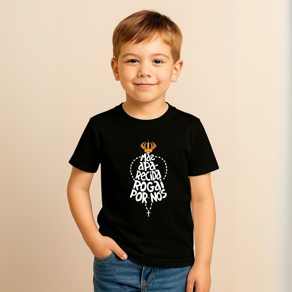 Camiseta Infantil Nossa Senhora Aparecida Rogai por Nós Católico Presente Criança Black Friday