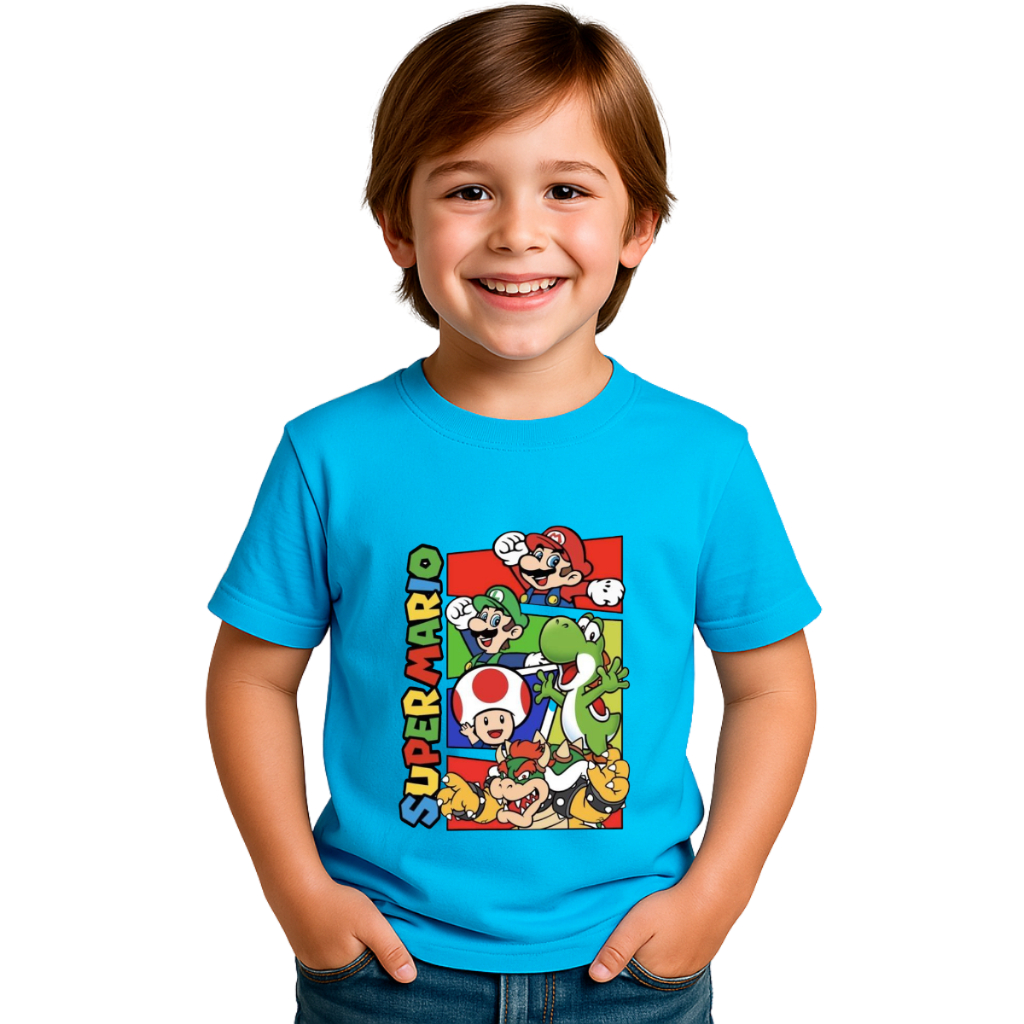 Camiseta Infantil Super Mario 100% Algodão Premium | Mario, Luigi, Yoshi e Toad | Tamanhos 2 a 16