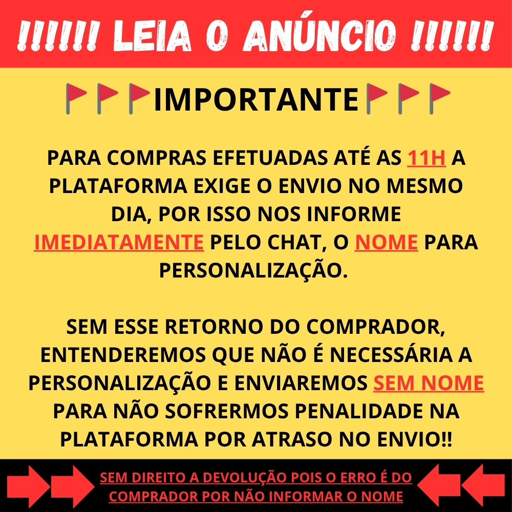 Camiseta branca infantil unissex manga curta 100% poliéster personalizada em sublimação. 🚩🚩🚩INFORME O NOME NO ATO DA COMPRA🚩🚩🚩 🚩🚩🚩INFORME O NOME NO ATO DA COMPRA🚩🚩🚩 🚩🚩🚩INFORME O NOME NO ATO DA COMPRA🚩🚩🚩 🚩🚩🚩INFORME O NOME NO ATO DA COMPRA🚩🚩🚩 🚩🚩🚩INFORME O NOME NO ATO DA COMPRA🚩🚩🚩 PARA COMPRAS EFETUADAS ATÉ AS 11H A PLATAFORMA EXIGE O ENVIO NO MESMO DIA, POR ISSO NOS INFORME IMEDIATAMENTE PELO CHAT, O NOME PARA PERSONALIZAÇÃO. POR SER OPCIONAL, SEM ESSE RETORNO ENTENDEREMOS QUE NÃO É NECESSÁRIA A PERSONALIZAÇÃO E ENVIAREMOS SEM NOME PARA NÃO SOFRERMOS PENALIDADE NA PLATAFORMA POR ATRASO NO ENVIO!!SEM DIREITO A DEVOLUÇÃO!! MATERIAL: POLIESTER 30/1 FIADO / 150 DE GRAMATURA 👕📐INFANTIL TAMANHOS DISPONÍVEIS: 2-4-6-8-10-12-14 👕📐ADULTO TAMANHOS DISPONÍVEIS: P, M & G (PEÇA O LINK PARA A COMPRA) Desenvolvemos qualquer tema: profissões, times, aniversários, filmes, games, seriados, desenhos, geek, nerd, música, datas comemorativas, caricaturas, fotos etc... Não encontrou sua arte😮? Entre em contato conosco, elaboramos a arte no mesmo dia!!😉