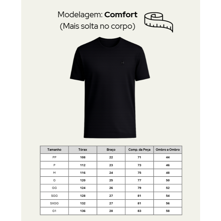 A Camiseta Malha Comfort é confeccionada em 96% Algodão e 4% Elastano, e é confeccionada em Meia Malha, é composta principalmente por Algodão e Elastano, tornando-a extremamente leve e macia. Além disso, possui ótima elasticidade, fazendo com que a peça tenha bom caimento ao corpo. O produto é confeccionada com modelagem Comfort, possui corte reto e modelagem mais solta ao corpo, é uma ótima opção para quem busca por leveza e conforto. Busca por um look completo? Ela pode ser combinada com shorts, jeans ou calças chino para criar looks despojados para o dia a dia. Você também pode adicionar uma jaqueta ou moletom para complementar sua composição nos dias mais frios. Método de Lavagem e Recomendações: Consulte sempre a etiqueta de lavagem do produto. - Lavar à mão ou à máquina com temperatura máxima de lavagem de 40°C; - Não usar alvejante a base de cloro; - Não limpar a seco; - Não secar em tambor; - Secagem na vertical à sombra; - Passar com chapa da base do ferro de no máximo 140°C; - HS1977