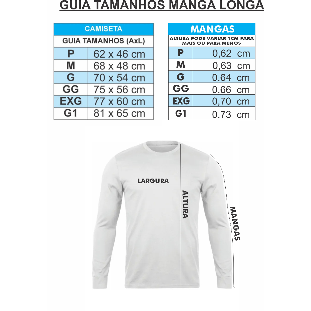 Camiseta Manga Longa CORES E TAMANHOS EM ESTOQUE Malha 100 poliéster Gola Careca redonda 𝗣 𝗠 𝗚 𝗚𝗚 𝐄𝐗𝐆 𝗚𝟏 ALTURA 62 68 70 75 77 83 LARGURA 46 48 54 56 60 65 MANGAS 63 66 69 70 71 73 Ficou com alguma dúvida Entre em contato estamos à disposição para te ajudar.