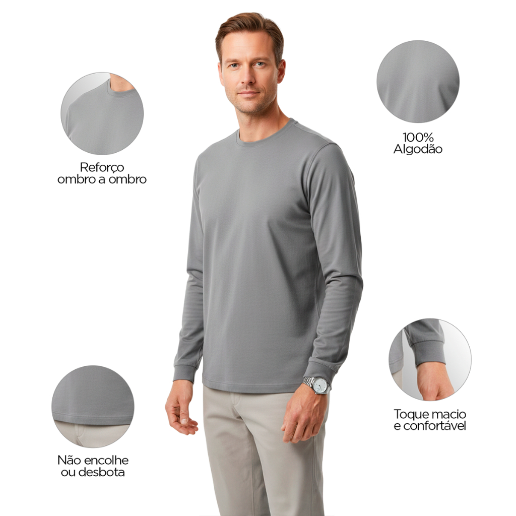Camiseta Manga Longa 100% Algodão Masculina Slim Premium Com Punho Gola Redonda Trabalho Frio Manga Comprida Unitário
