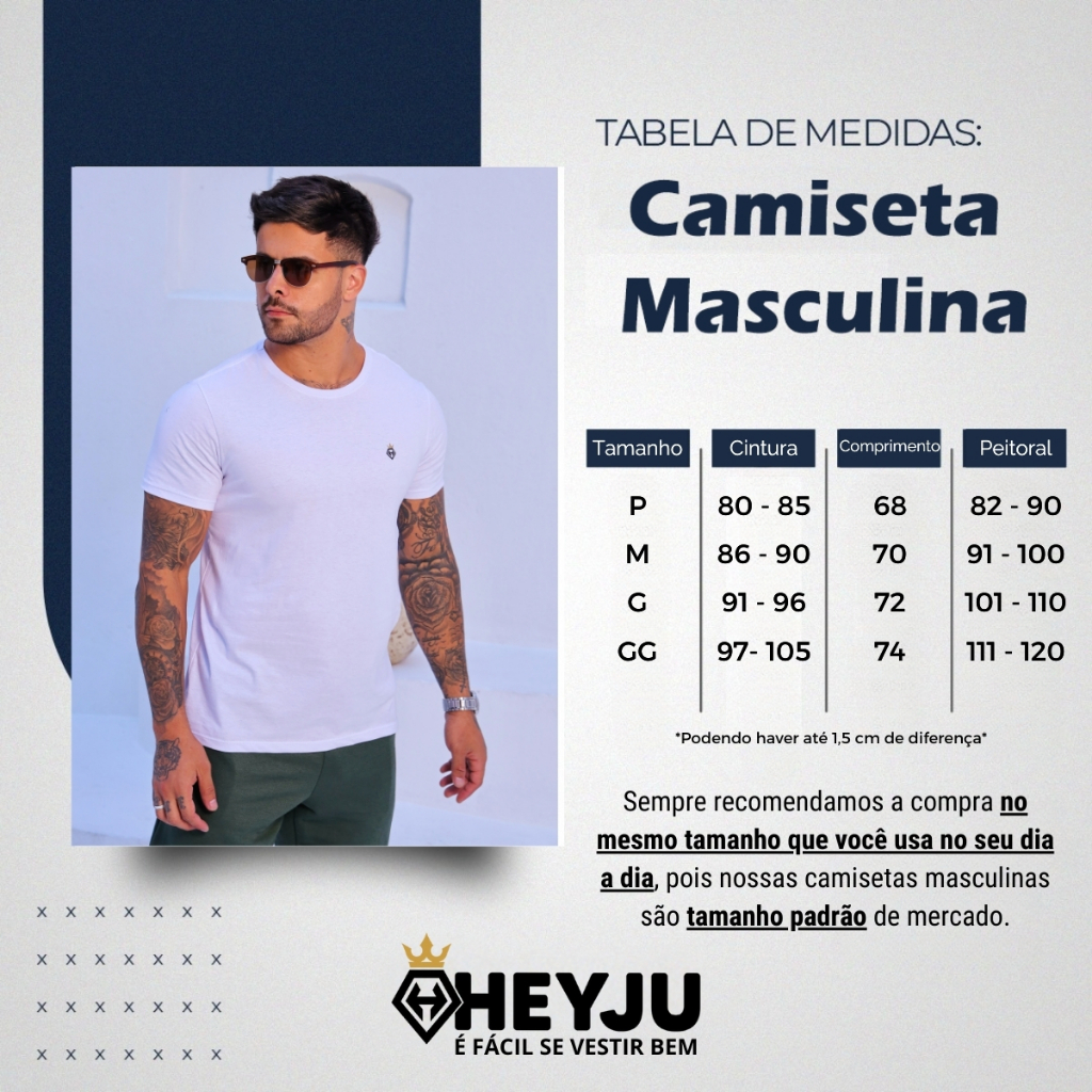 Camiseta Masculina Algodão Básica 30.1 Lisa Original Heyju A Camiseta básica confeccionada em 100% Algodão com conforto e estilo em uma única peça. Desenvolvida com uma modelagem moderna, tecido resistente e confortável, tornando uma peça versátil e atemporal perfeita para qualquer ocasião. Especificações: - Costura reforçada; - Gola redonda. Tabela de medidas: -Tamanho P veste 36-38 -Tamanho M veste 40-42 -Tamanho G veste 44-46 -Tamanho GG veste 46-48 Dúvidas frequentes: - Produto acompanha nota fiscal? Sim, todos os nossos produtos acompanham a nota fiscal. - Tem a pronta entrega? Sim, todos os produtos anunciados estão disponíveis para envio imediato. - O produto é novo? Sim, todos os produtos são novos. Somos a loja da marca Heyju. - Ainda precisa de ajuda? Utilize o campo de perguntas e esclareça suas dúvidas diretamente com um de nossos atendentes. Quem somos? Desde 1978, produzimos roupas para marcas brasileiras. Em 2015, lançamos a Heyju, criando peças próprias com carinho. Expandimos online em 2017, destacando-nos nos principais marketplaces. Na Heyju, unimos moda e estilo para que todos possam se vestir bem. Bem-vindos à Heyju!