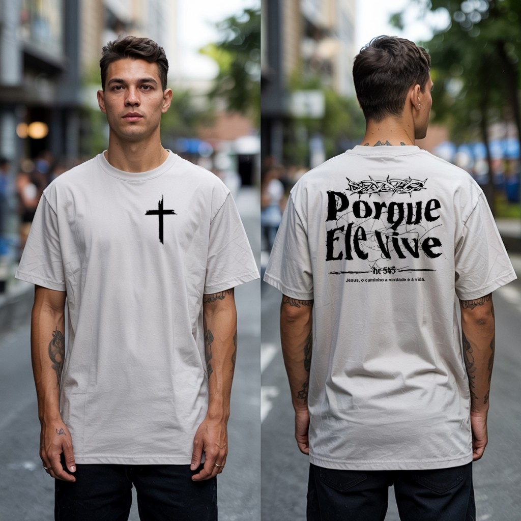 Camiseta Masculina Algodão Cruz Porque Ele Vive Jesus Camisa