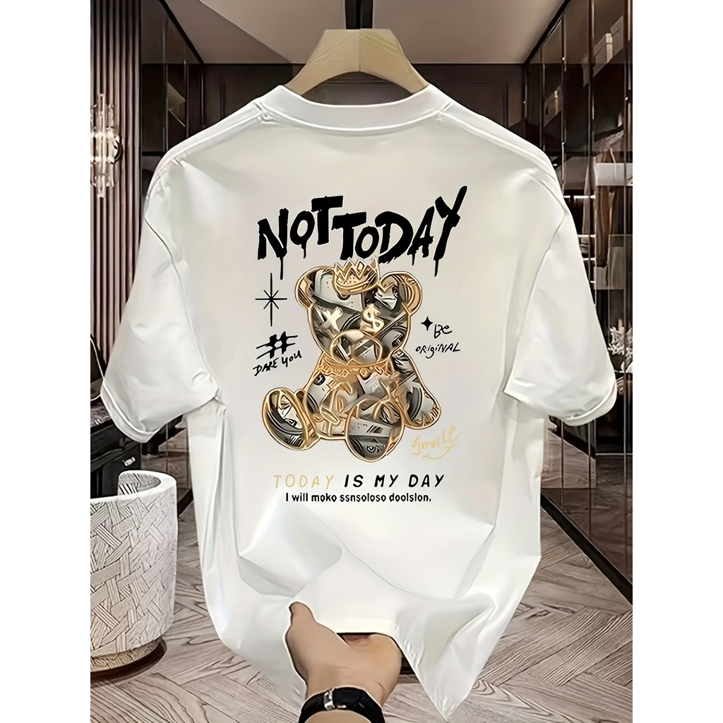 Camiseta Masculina Casual Verão 100% Algodão Estampa Urso "Not Today" - Solto e Confortável