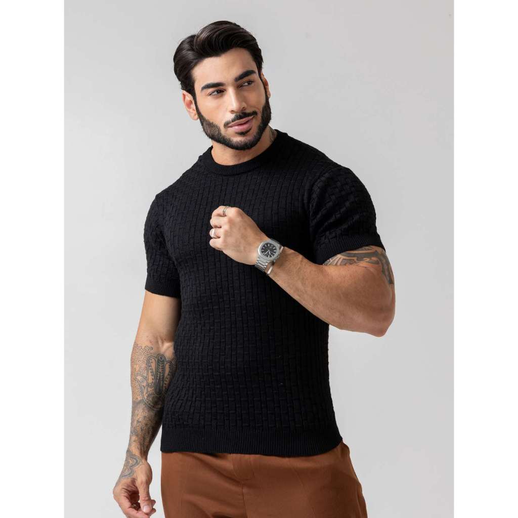 camiseta masculina de tricot com manga curta gola redonda padrão verão chique