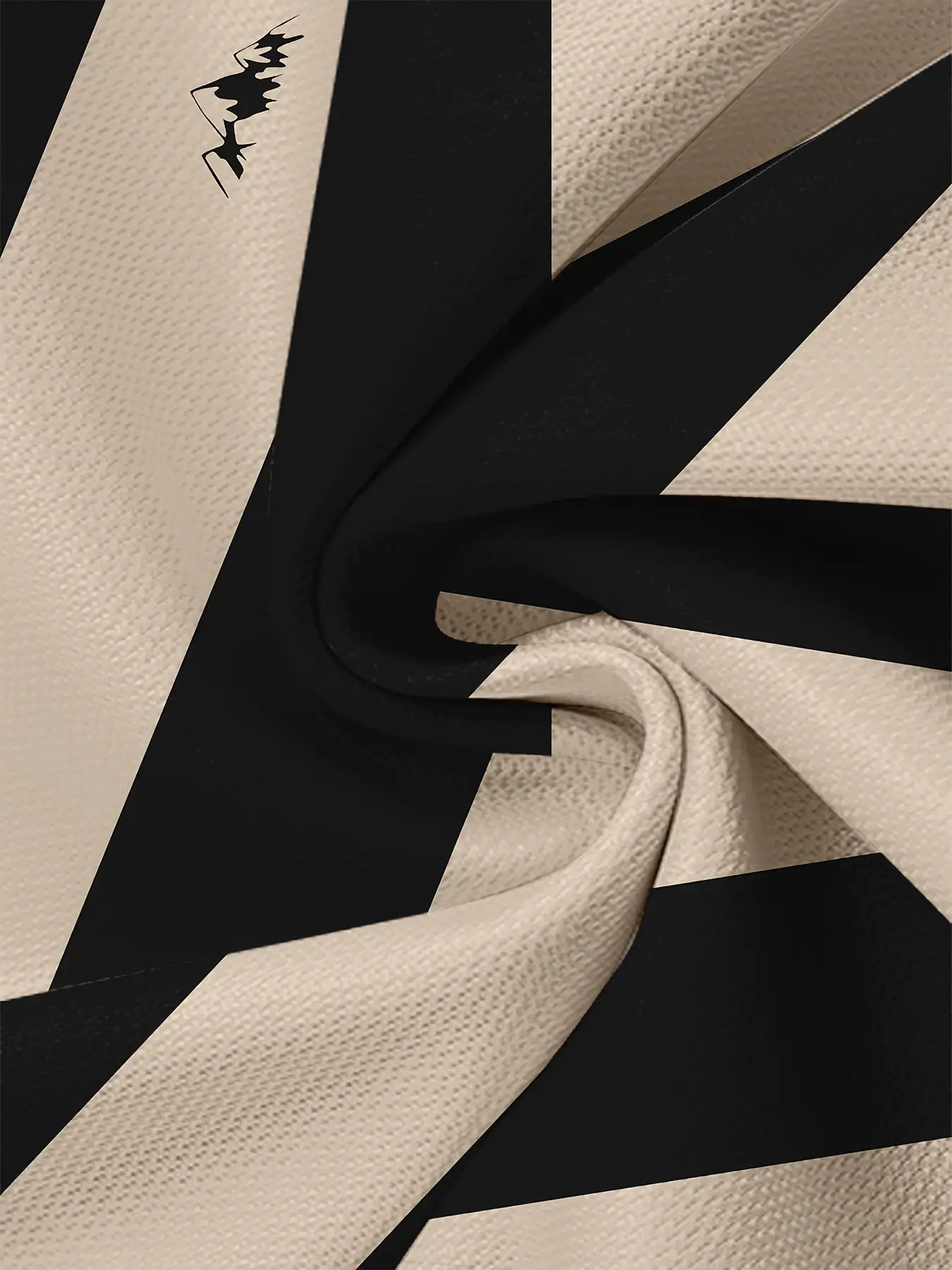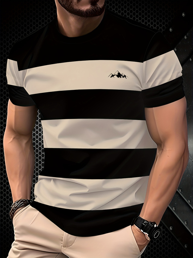 Camiseta Masculina Listrada Com Gola Redonda , Contraste Preto E Branco | Impressão De Montanha Top Clássico Casual De M