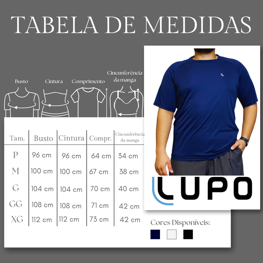 DETALHES DO PRODUTO . Manga curta; . Gola redonda; . Logo refletiva; . Com tecnologia Dry em absorção de suor; . Confeccionada em poliéster. TABELA DE MEDIDAS: P: Cintura: 96 cm / Busto: 96 cm / Altura: 64 cm / Circunferência da manga: 34 cm ; M: Cintura: 100 cm / Busto: 100 cm / Altura: 67 cm / Circunferência da manga: 38 cm ; G: Cintura: 104 cm / Busto: 104 cm / Altura: 70 cm / Circunferência da manga: 40 cm ; GG: Cintura: 108 cm / Busto: 108 cm / Altura: 71 cm / Circunferência da manga: 42 cm ; XG: Cintura: 112 cm / Busto: 112 cm / Altura: 73 cm / Circunferência da manga: 42 cm ; COMPOSIÇÃO: 100% poliéster -A Camiseta Lupo Sport destaca-se pela manga curta e gola redonda, oferecendo conforto e liberdade de movimento, ideal para atividades físicas e uso diário. O tecido 100% poliéster, leve e resistente, é complementado pela tecnologia Dry, que absorve o suor e mantém o corpo seco, aumentando o conforto durante os exercícios. A logo refletiva adiciona segurança, tornando o usuário mais visível em condições de pouca luz. -Para um look esportivo, combine a camiseta com shorts ou calças de corrida e tênis adequados. Em ocasiões casuais, use-a com jeans ou bermuda e sapatos casuais. Em dias mais frios, utilize a camiseta como camada base sob um moletom ou jaqueta leve, garantindo conforto térmico sem perder a versatilidade. PERGUNTAS FREQUENTES: O produto vem igual ao da foto? R: Sim, garantimos que o produto será idêntico à imagem, com fotos tiradas com cuidado. Qual tamanho fica bom para mim? R: Consulte nossa tabela de medidas na descrição do produto ou nas imagens para escolher o tamanho adequado. Vocês enviam no mesmo dia? R: Sim, enviamos pedidos no mesmo dia se realizados antes do horário de corte; pedidos feitos depois serão enviados no próximo dia útil. VIA CLOSET - NOSSA FAMÍLIA VESTE A SUA ! Somos um grupo familiar com mais de 50 anos de experiência em roupas infantis e adultas no Paraná. Nosso objetivo é oferecer produtos de qualidade, acessíveis e alinhados com as últimas tendências da moda, sempre buscando satisfazer nossos clientes. SKU: 240046