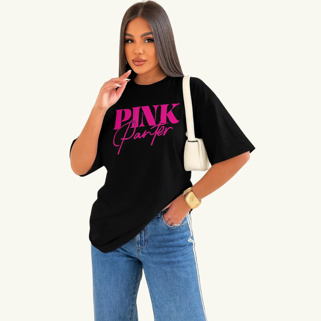 Camiseta Max Feminina Oversized Estampa Pantera frente e costas NOVA 100% Algodão