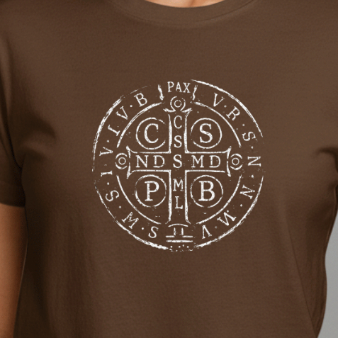 Camiseta Medalha de São Bento Minimalista Católica Algodão Premium 30.1 Casual Elegante
