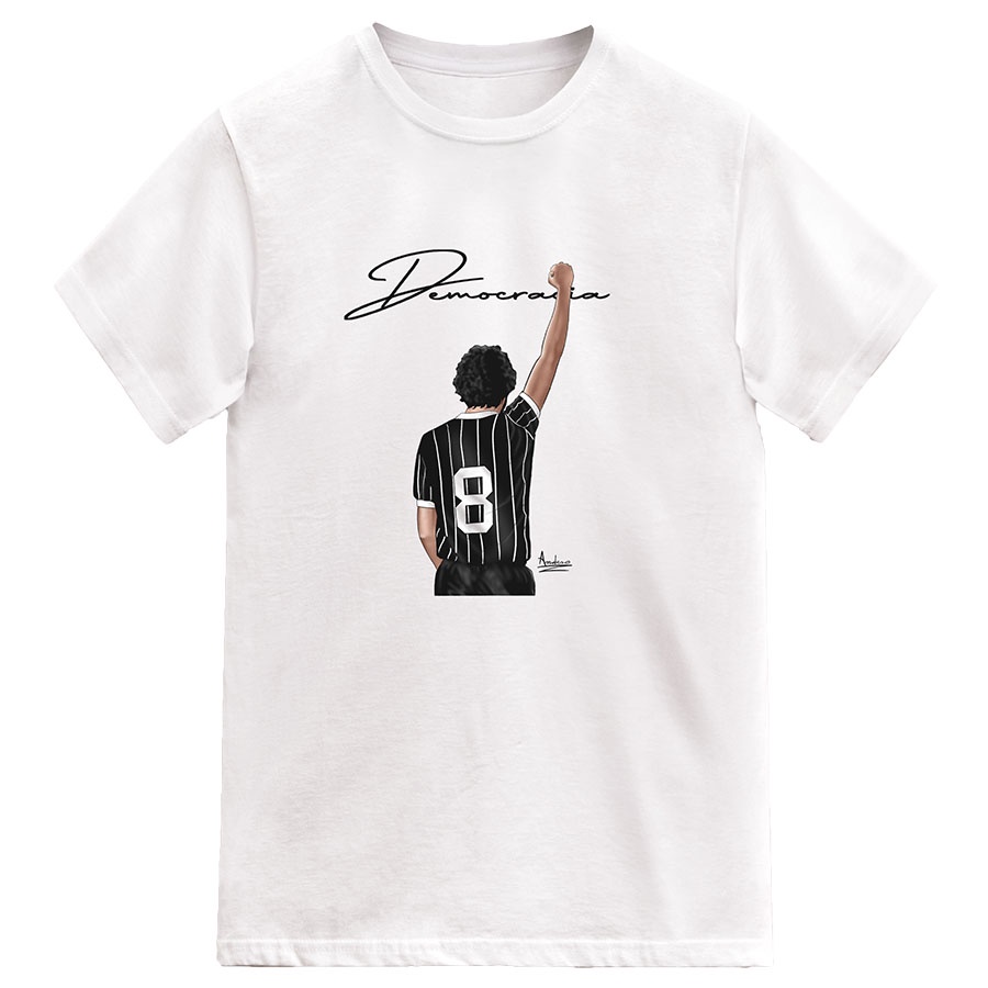 Camiseta de futebol com estampa ilustrativa ilustrativa do Doutor Sócrates, um dos maiores jogadores da história do Timão e grande símbolo da equipe que marcou época no início da década de 1980 com títulos e com a chamada "Democraria Corinthiana", que lutava pela volta da democraria no país. Tecido: 100% algodão Tipo de Estampa: Impressão Digital (DTG)/Silk Digital Grade de Tamanhos: P (51cm L x 68cm A) M (53cm L x 70cm A) G (57cm L x 72cm A) GG (60cm L x 76cm A) EGG (64cm L x 79cm A).