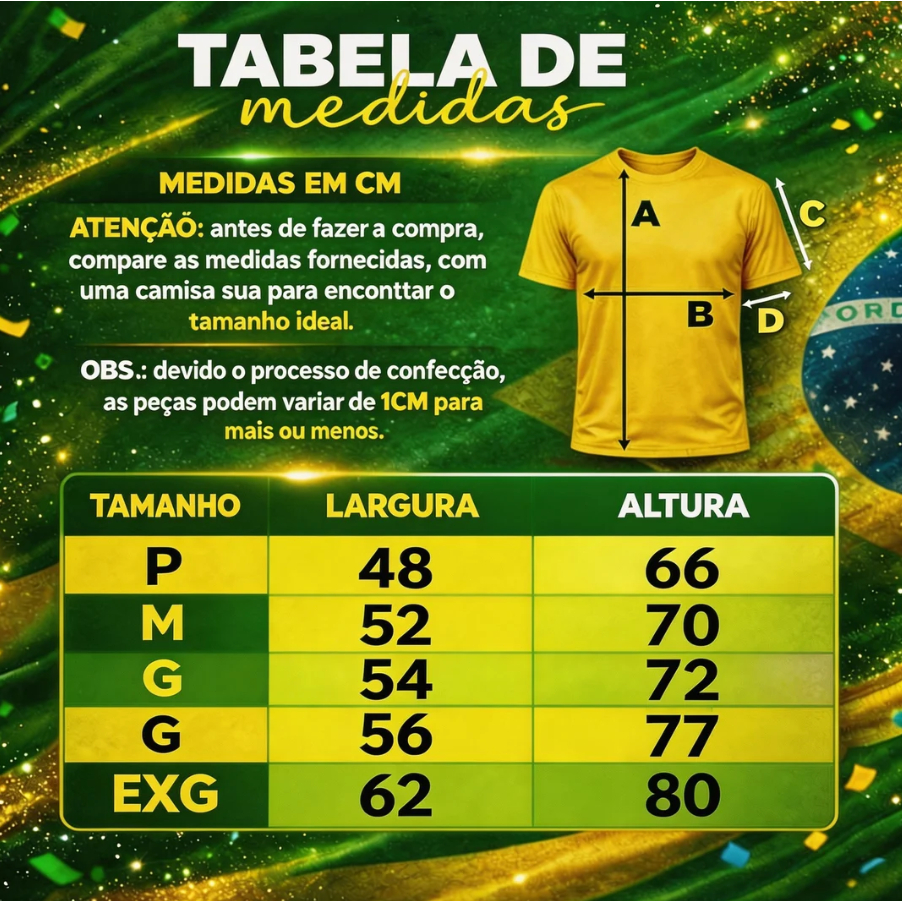 Bem-vindo à nossa loja oficial no 2000Fun Brasil! Somos especialistas em camisetas estampadas de alta qualidade, com foco em designs retrô (vintage) que celebram a cultura brasileira, Oferecemos também personalização exclusiva com serviço completo. ✅ Personalização Total: Crie Sua Camiseta Única Não encontrou o design dos seus sonhos? Não se preocupe! Oferecemos serviço de personalização completa: você pode enviar o seu próprio logo, foto, frase, desenho ou qualquer imagem que quiser, e nós transformamos em uma estampa de alta qualidade na camiseta. Ideal para presentear amigos e familiares, criar looks exclusivos, ou até mesmo para equipes de trabalho, eventos e festas. Nosso processo de personalização é simples, rápido e seguro: basta enviar o arquivo do seu design, escolher o modelo da camiseta e aguardar a entrega — tudo feito com muito cuidado para garantir que o resultado seja exatamente o que você imaginou. ✅ Fabricação Brasileira: Qualidade e Confiança Todas as nossas camisetas são fabricadas e estampadas no Brasil, com materiais de alta qualidade (algodão 100% ou mistura confortável) que garantem durabilidade, suavidade na pele e resistência às lavagens — sem perder a cor ou a forma da estampa. Nossa fábrica brasileira segue padrões de excelência, garantindo que cada peça seja revista e aprovada antes de chegar até você. ✅ Qualidade Garantida e Atendimento Especializado Nosso compromisso é com a satisfação do cliente: desde a escolha do design até a entrega, estamos aqui para ajudar. Todas as camisetas passam por rigorosos testes de qualidade, e oferecemos política de troca e devolução transparente, caso haja qualquer problema. ✅ Para Quem é Nossa Loja? Para você que ama camisetas com personalidade, que valoriza a qualidade e a originalidade; para o torcedor brasileiro que quer celebrar a Copa do Mundo com estilo; para quem gosta de designs retrô e quer expressar sua identidade cultural; e para todos que buscam um produto feito no Brasil, com amor e dedicação. Navegue por nossa loja, explore as coleções, crie sua camiseta personalizada ou escolha um design pronto que conquiste seu coração. Estamos ansiosos para ajudar você a vestir seu estilo, com camisetas estampadas que contam sua história. Obrigado por escolher nossa loja — sua satisfação é a nossa maior recompensa! Categoria do Atributo Especificação Estampa:Slogan Estação:Todas as estações Tipo de Manga:Manga regular Estilo:Tendência - Casual Urbano Bainha:Regular Características:Macia Público-Alvo:Regular Cor:Branca Gola:Gola redonda Comprimento da Manga:Manga curta Comprimento:Regular Caimento:Ajuste relaxado Elasticidade do Tecido:Baixa elasticidade Material:Poliéster Composição:100% Cotton Instruções de Lavagem:Lavar à máquina, não lavar a seco Forro Térmico:Não Transparência:Não