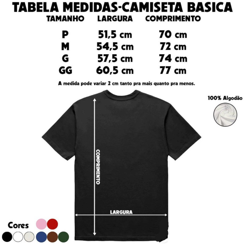 👕 CAMISETA PERSONALIZÁVEL – ESCOLHA O MODELO 👕 Aqui você escolhe como quer usar 👉 Básica ou Oversized Ambas em 100% algodão, confortáveis e perfeitas para personalização. ✨ MODELOS DISPONÍVEIS ✨ 🔹 Camiseta Básica – caimento tradicional 🔹 Camiseta Oversized – mais larga, alongada e com manga maior 📏 TABELA DE MEDIDAS – CAMISETA BÁSICA • P – Largura: 51,5 cm | Comprimento: 70 cm • M – Largura: 54,5 cm | Comprimento: 72 cm • G – Largura: 57,5 cm | Comprimento: 74 cm • GG – Largura: 60,5 cm | Comprimento: 77 cm 📏 TABELA DE MEDIDAS – CAMISETA OVERSIZED • P – Largura: 51,5 cm | Comprimento: 71,5 cm | Manga: 24 cm • M – Largura: 54,5 cm | Comprimento: 74 cm | Manga: 25 cm • G – Largura: 57,5 cm | Comprimento: 76,5 cm | Manga: 26 cm • GG – Largura: 60,5 cm | Comprimento: 79 cm | Manga: 27 cm ⚠️ As medidas podem variar até 2 cm para mais ou para menos. 🎨 Cores disponíveis conforme anúncio 🧵 100% algodão 📌 Dica importante: Meça uma camiseta que você já tem e compare com a tabela antes de escolher o tamanho 😉