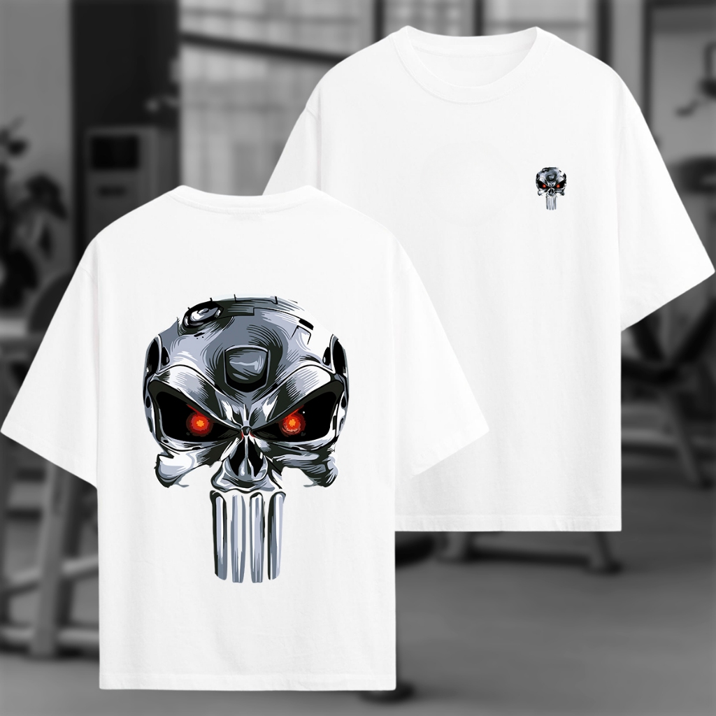 Camiseta Oversized Ou Básica Skull Cyborg Caveira Metálica Academia Gym Streetwear Promoção