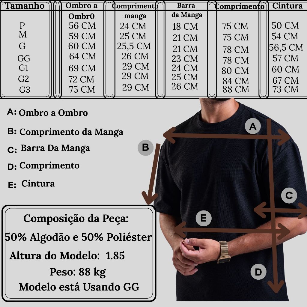 Novo Lançamento MF Style: *LEIA COM ATENÇÃO * *ENVIAMOS EM ATE 48H EM DIA UTEIS* A Camiseta Oversized lisa, possui uma textura que facilita a ventilação para seu dia a dia, Foi elaborada pensando mais no estilo casual da atualidade levando para você conforto e elegância. COMPOSIÇÃO: 50% Algodão e 50% Poliester. **Temos a imagem de medidas acima no anuncio** E aqui Também temos Medidas para você fazer a melhor escolha: P Comprimento Total Costa: 75cm Largura Cintura: 50cm Largura Barra Manga: 18/cm Comprimento Manga: 24cm Largura Ombro a Ombro: 56cm M Comprimento Total Costa: 75cm Largura Cintura: 54cm Largura Barra Manga: 21cm Comprimento Manga: 25cm Largura Ombro a Ombro: 59cm G Comprimento Total Costa: 78cm Largura Cintura: 56,5 cm Largura Barra Manga: 21 cm Comprimento Manga: 25,5 cm Largura Ombro a Ombro: 60cm GG Comprimento Total Costa: 78cm Largura Cintura: 60cm Largura Barra Manga: 23cm Comprimento Manga: 26cm Largura Ombro a Ombro: 64cm G1 Comprimento Total Costa: 80cm Largura Cintura: 67cm Largura Barra Manga: 24cm Comprimento Manga: 29cm Largura Ombro a Ombro: 69cm G2 Comprimento Total Costa: 84cm Largura Cintura: 70cm Largura Barra Manga: 25cm Comprimento Manga: 29cm Largura Ombro a Ombro: 72cm G3 Comprimento Total Costa: 88 cm Largura Cintura: 73 cm Largura Barra Manga: 26 cm Comprimento Manga: 29cm Largura Ombro a Ombro: 75 cm * as medidas podem variar em até 2 cm *cores podem sofrer alterações de acordo com seu aparelho e sua configuração.