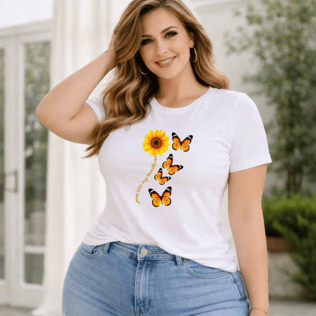 Camiseta Plus Size Premium Feminina Estampada Do P Ao G5 Girassol Borboletas Academia Treino 100% Algodão Verão