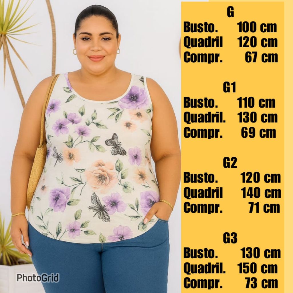 BLUSA REGATA TAMPA BUMBUM PLUS SIZE. FEITO EM VISCOLYCRA ESTAMPADA PREMIUM, MATERIAL LEVE, CONFORTAVEL DE OTIMA QUALIDADE, MODELAGEM AMPLA. não são pequenas, vestem ate mais do que indica na tabela. EXELENTE PARA O DIA A DIA EM CASA, PARA O TRABALHO E LAZER, OTIMA PARA AQUELA CAMINHADA NO FINAL DA TARDE, OU AQUELE TREINO NA ACADEMIA. em qualquer ocasião vc estara bem vestida e confortavel. ATENÇÃO: devido a alta demanda de pedidos, a reposição das cores pode ser em variant de diferente, seguindo sempre a mesma cor, mas a estampa pode sofrer alteração. qualquer duvida estamos a disposição. antes e pos venda. MEDIDAS; TAMANHO G: BUSTO 100CM, QUADRIL 120CM, COMPRIMENTO 67CM. TAMANHO G1: BUSTO 110CM, QUADRIL 130CM, COMPRIMENTO 69CM. TAMANHO G2: BUSTO 120CM, QUADRIL 140CM, COMPRIMENTO 71CM. TAMANHO G3: BUSTO 130CM, QUADRL 150CM, COMPRIMENTO 73CM. veste com muito conforto quem usa a numeração, do 40 ao 54. ATENÇÃO: qualquer duvida, não hesite em nos chamar pelo chat, a fileti tem uma equipe treinada e a disposição para ajudar vc a escolher o melhor modelo e o tamanho ideal ao seu gosto, para que vc tenha uma otima experiencia de compras aqui na shopee. venha, sera um prazer atender vc, antes e apos venda, estamos a disposição. moda plus size #plus size FILETI MODA PLUS: a fileti e fabricante, por isso tem um produto de qualidade com preço justo, que so quem fabrica pode oferecer. nossos produtos são a pronta entrega. ENVIOS: a shopee coleta o seu pedido aqui na fabrica em ate 24hs uteis apos confirmar o pagmento. VEM VC TBM PARA FILETI MODA PLUS E SE SURPREENDA COM A QUALIDADE DE NOSSOS PRODUTOS.