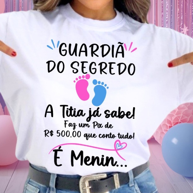 [Camiseta Premium em Algodão Puro]SISI Camisa ''Chá Revelação Guardiã Do Segredo Titia Já Sabe Pezinhos Rosa E Azul''