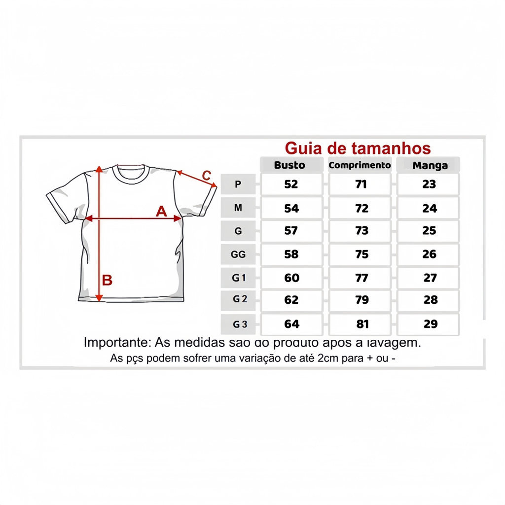 Produtos a pronta entrega para postagem imediata em até 24h Camiseta De Algodão Camisa Entrega Mais Rápida Do Brasil! Produção local da fábrica Excelentes preços e ótima qualidade Estampa em DTF, melhor qualidade 100% Algodão . Feito com muito capricho Você não vai se arrepender de ter escolhido SISI Official Brand Store Conforto e Versatilidade Tecido premium 100% algodão, garantindo um toque macio e respirabilidade para o dia a dia. Essa camiseta é ideal para qualquer ocasião, oferecendo elegância e versatilidade ao seu guarda-roupa. Confeccionada em tecido de alta qualidade! Perfeito caimento ;Não encolhe; Não desbota. Dimensões: COMPRIMENTO | LARGURA | MANGAS P : 71cm | 52cm | 23cm M : 72cm | 54cm | 24cm G : 73cm | 57cm | 25cm GG : 75cm | 58cm | 26cm G1 : 77cm | 60cm | 27cm G2 : 79cm | 62cm | 28cm G3 : 81cm | 64cm | 29cm Serviço Pós-Venda: Em caso de dúvidas, entre em contato conosco durante o horário de atendimento do serviço de atendimento ao cliente, de segunda a sexta-feira, das 9:00 às 18:00. Faremos o nosso melhor para resolver todos os problemas relacionados ao pós-venda de forma perfeita. - Importante: Selecione a cor e o tamanho desejado ao seu carrinho, faça sempre a conferência dos itens. * ATÊNÇÂO * 1 - Todos os nossos produtos são revisados antes de serem embalados. 2 - A forma é tamanho padrão, por isso recomendamos comprar o número que habitualmente usa. 3 - Consulte se a numeração dos modelos desejados está disponível. e faça a medição em centímetros para não errar no tamanho. 4 - Assim que o pagamento for confirmado, enviamos o produto em até 2 dias úteis. 5 - O prazo de entrega é uma estimativa de quando o item será entregue após o envio. Essa estimativa é calculada pelos Correios e não pelo vendedor. Algumas cidades têm entregas programadas. 6 - Você pode consultar o Status do Pedido online sempre que desejar. Basta clicar em "Compras" e "Ver detalhes". 7 - EM COMPRAS DE KITS OU ACIMA DE 02 PRODUTOS, ENVIAR MENSAGEM JUNTO AO PRODUTO ESPECIFICANDO QUAL SERAM AS CORES E OS MODELOS DOS MESMOS! (CASO CONTRÁRIO SERÁ ENVIADO CONFORME O QUE FOI COMPRADO) 8 - Não fazemos trocas pois os custos de envio e retorno é por CONTA DO COMPRADOR, portanto analise corretamente as medidas antes da aquisição. 9 - EM CASO DE ERRO NO ENVIO DOS PRODUTOS O REEMBOLSO É GARANTIDO! Clicando em comprar você concorda com os termos. Muito obrigada pela visita! Espero que tenha gostado deste anuncio :)
