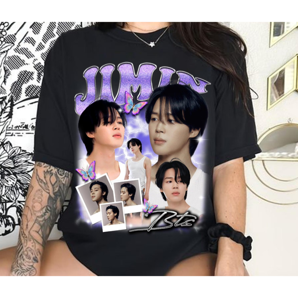 Camiseta Preta Unissex, Design com Colagem de Taehyung (BTS V) em Estilo Elétrico e Fã